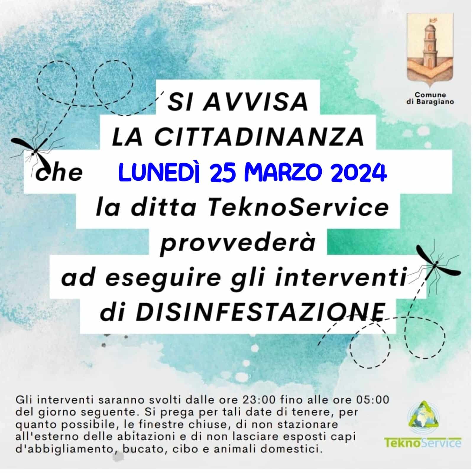 Descrizione Si avvisa la cittadinanza che lunedì 25 Marzo 2024 la ditta TeknoService provvederà ad eseguire gli interventi di disinfestazione.