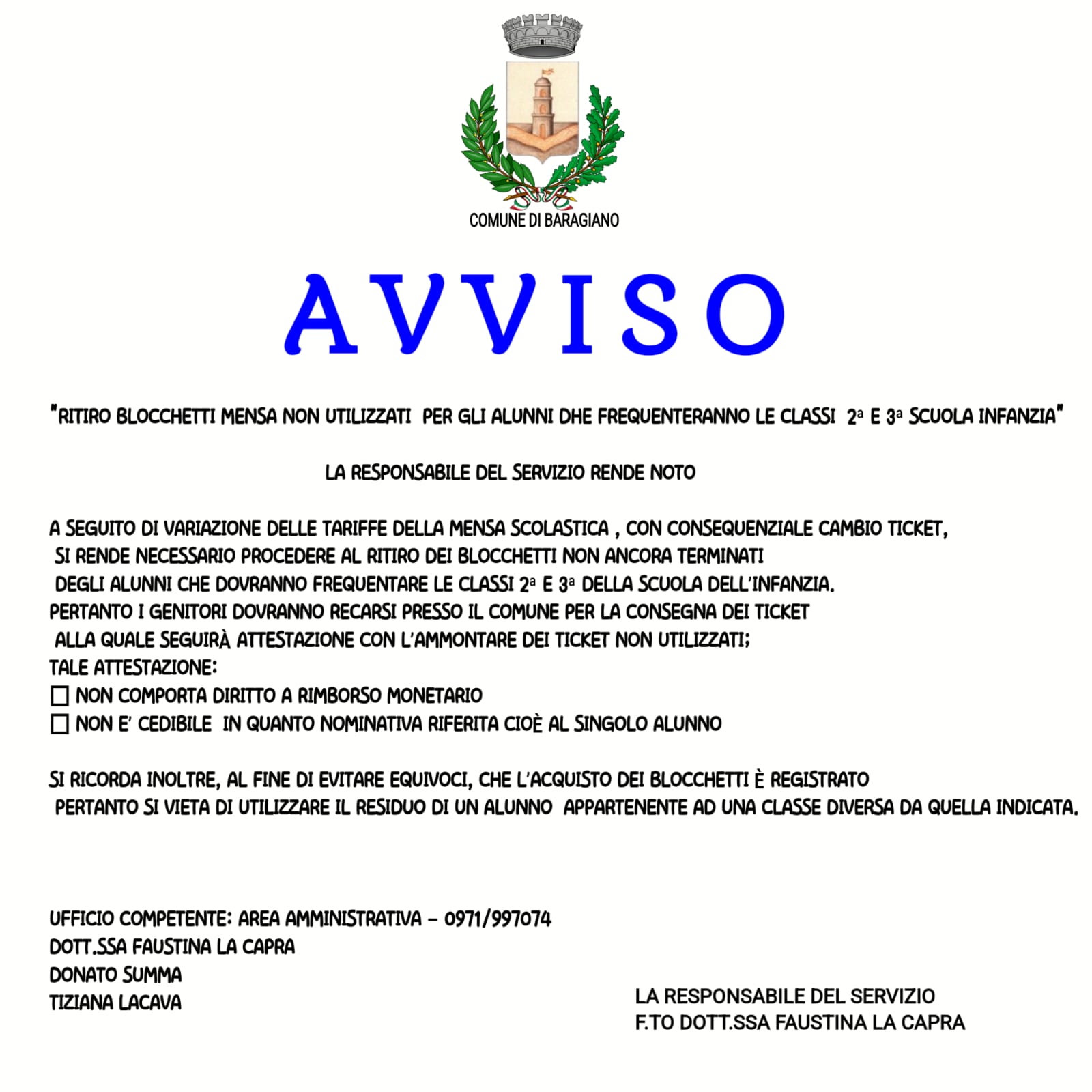 Descrizione Ritiro blocchetti mensa non utilizzati per gli alunni che frequenteranno il 2° e 3° anno di scuola dell'infanzia.